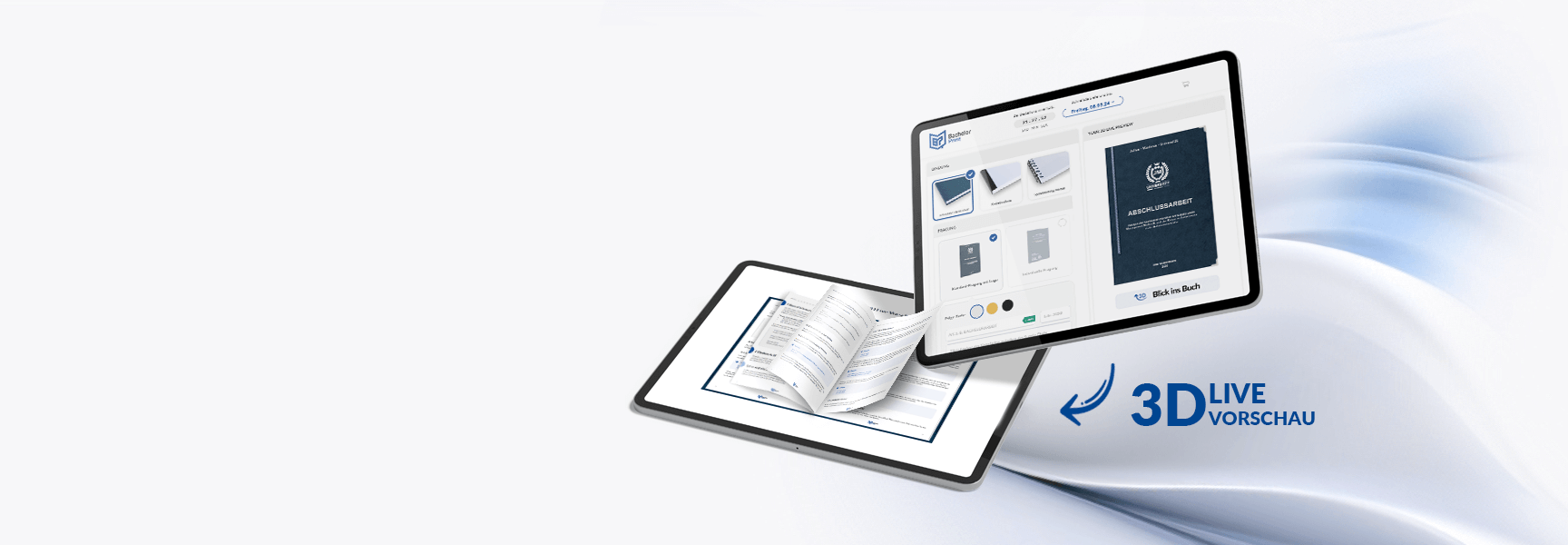 Der Online-Shop von BachelorPrint bietet zahlreiche Möglichkeiten, deine Bindung zu konfigurieren. Du kannst die Farbe der Bindung auswählen, eine individuelle Prägung gestalten und deine Bindung mit Extras wie einem Leseband, Buchecken oder einem Faltplan vervollständigen.